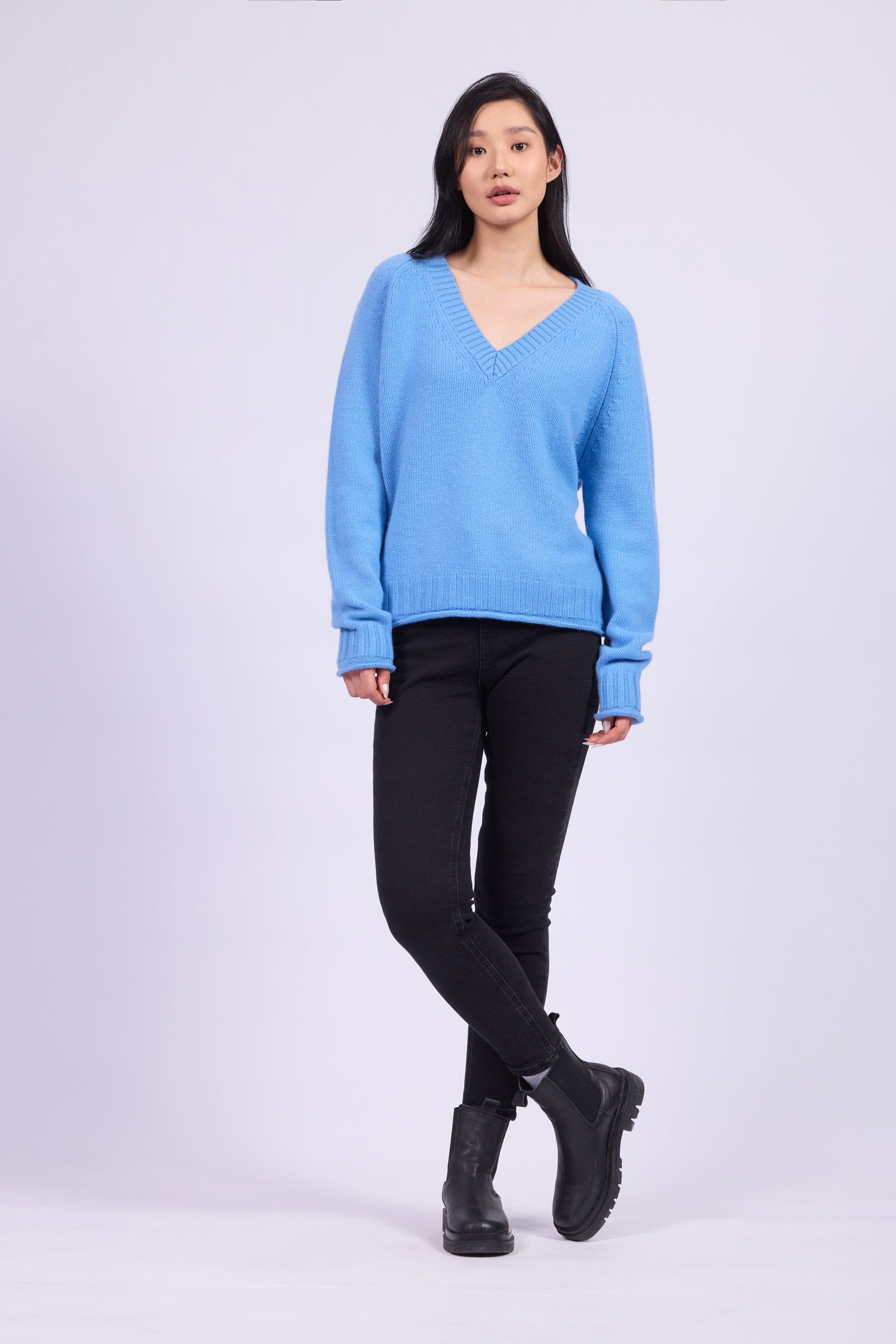 This is a thick cashmere sweater in a vibrant colors. It features a V-neckline with a ribbed knit detail around the collar, cuffs, and hem. The texture appears soft and cozy, and the sweater has a slightly relaxed fit, making it suitable for casual or semi-casual outfits.
